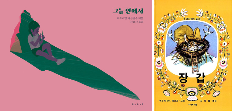 풀 한포기, 나무 한 그루 없다. 태양의 작열, 야광 주황빛으로 빼곡히 채워진 가로로 긴 직사각 공간에 바위 하나 있다. 한 여자 아이가 바위 그늘 안으로 들어간다. 이어 뱀, 여우, 토끼, 고슴도치, 멧돼지, 염소, 새 떼들도 온다. 해가 기움에 따라 바위 그늘의 길이도 짧아졌다 길어진다. 생명들은 어둠이 오기를 기다리며 어떻게든 그늘 안에 함께 있으려 애를 쓴다. 또 다른 그림책이 떠오른다. 여름이 아닌 겨울이야기다. 인간이 숲에 떨어뜨리고 간 두툼한 겨울 장갑 속으로 먹보 생쥐, 팔짝팔짝 개구리, 빠른 발 토끼, 멋쟁이 여우, 송곳니 멧돼지, 느림보 곰이 추위를 피하기 위해 차례로 모여 드는 이야기다.