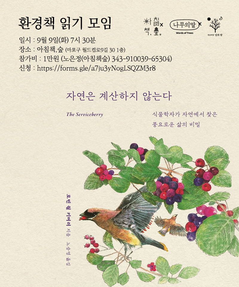 다음 모임은 9월 둘째 주 화요일 9월 9일 저녁 7시 30분에 아침책,숲에서 열립니다. 함께 읽을 책은 <자연은 계산하지 않는다>입니다. <향모를 땋으며>, <이끼와 함께>의 저자 로빈 윌 키머러의 세 번째 책입니다. 우리가 잊어서는 안 될 호혜와 상호 연결의 세계에 관해 이야기합니다. 다 함께 풍요로워지기 위해서는 어떤 방식, 어떤 태도로 살아가야 할까요? 함께 고민하고 모색해 봅시다. 참여하고 싶은 분은 신청해 주세요. |