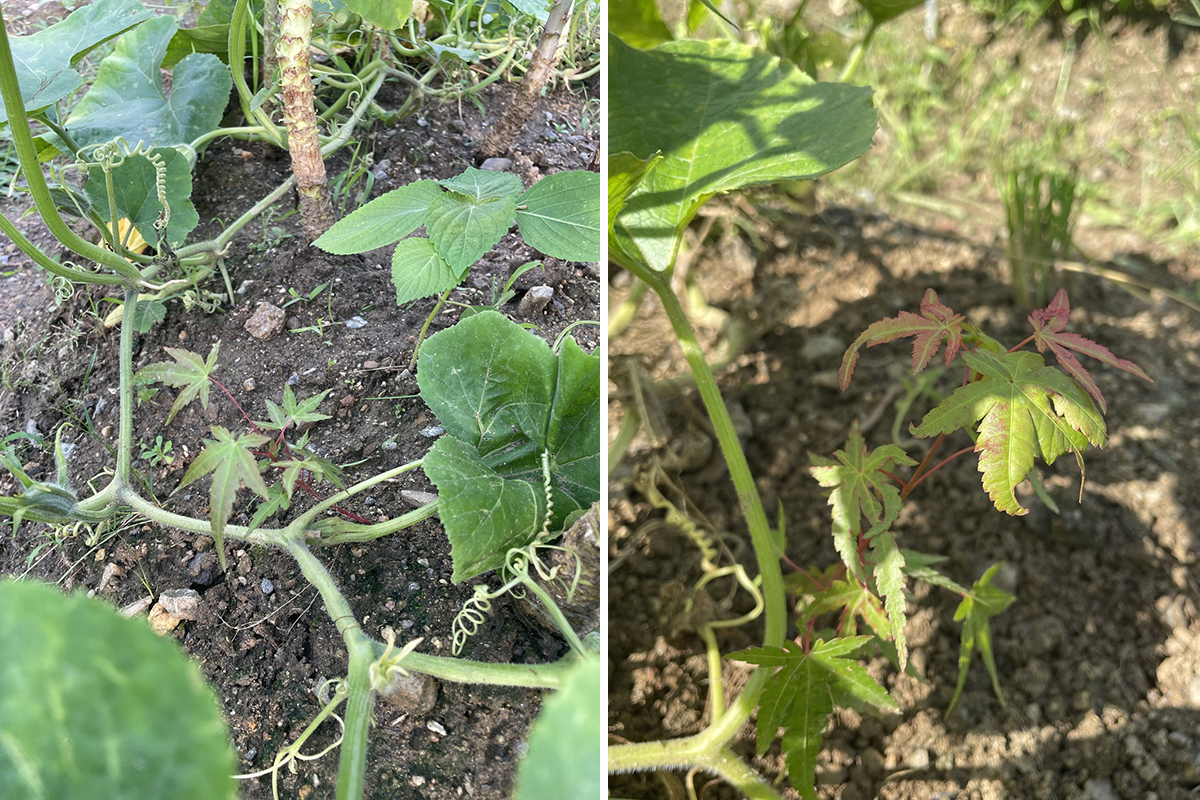 여름 작물과의 작별이 가까워지는 지금, 밭에서는 또 다른 생명이 은근하게 자라나고 있다. 바로 ‘단풍나무 움’이다. 밭 구석에서 호박 줄기를 방패 삼아 숨어 있듯 자라난 녀석은 내가 심지 않은, 자연이 선물한 존재이다. 갈 때마다 슬쩍 보았는데, 다행히 고사하지 않았다. 호박잎 뒤에서 뜨겁고 가물었던 나날을 견디며 조금씩 몸집을 키우는 아기 나무! 그야말로 8월처럼 뜨겁게 살아내고 있었다. 하하, 너란 녀석은 참….