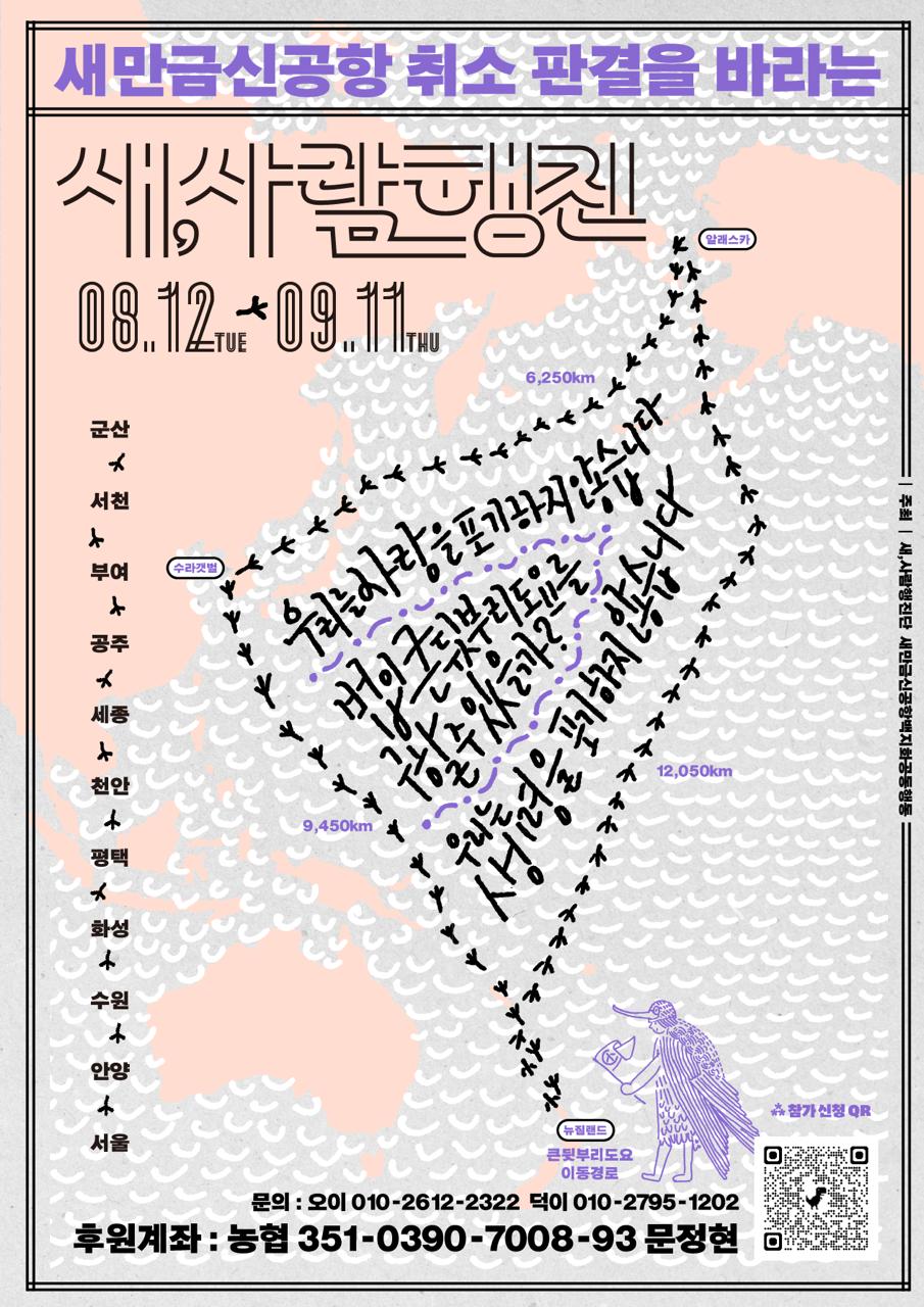 2025년 8월 12일부터 9월 11일까지, 전북지방환경청에서부터 서울행정법원까지 '새만금신공항 취소 판결'만을 바라며 길을 걸은 사람들이 있습니다. 그들은 수라갯벌에 사는 뭇 생명들을 지키기 위해 종이로 만든 새 모자를 쓰고, 새와 생명들을 그림으로 그려 들고, 수라갯벌을 지켜달라고 외치며 매일 뜨거운 아스팔트 위를 걸어왔습니다.
