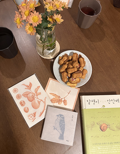 매달 둘째 주 화요일에는 환경책 읽는 모임이 열립니다. 아침책숲 x 나무의말 x 계절책방 낮과밤이 함께 꾸려나가고 있어요. 11월 모임에서 함께 읽은 책은 <달팽이 안단테>(엘리자베스 토바 베일리 지음, 김병순 옮김, 돌베개 펴냄)입니다. 이번 모임에서는 참가자들이 그동안 작업했던 그림을 가지고 만든 책과 엽서를 선물로 나누기도 했습니다. ^^ 환경모임 참가자들답게 자연을 주제로한 작업을 하고 있네요.